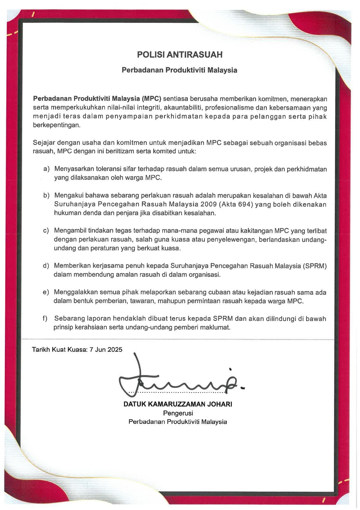 MPC upholds integrity, transparency, and accountability through clear policies and codes of ethics. The following documents guide our organisation in preventing conflict of interest, managing gifts, protecting whistleblowers, strengthening anti-corruption measures, and ensuring ethical conduct.