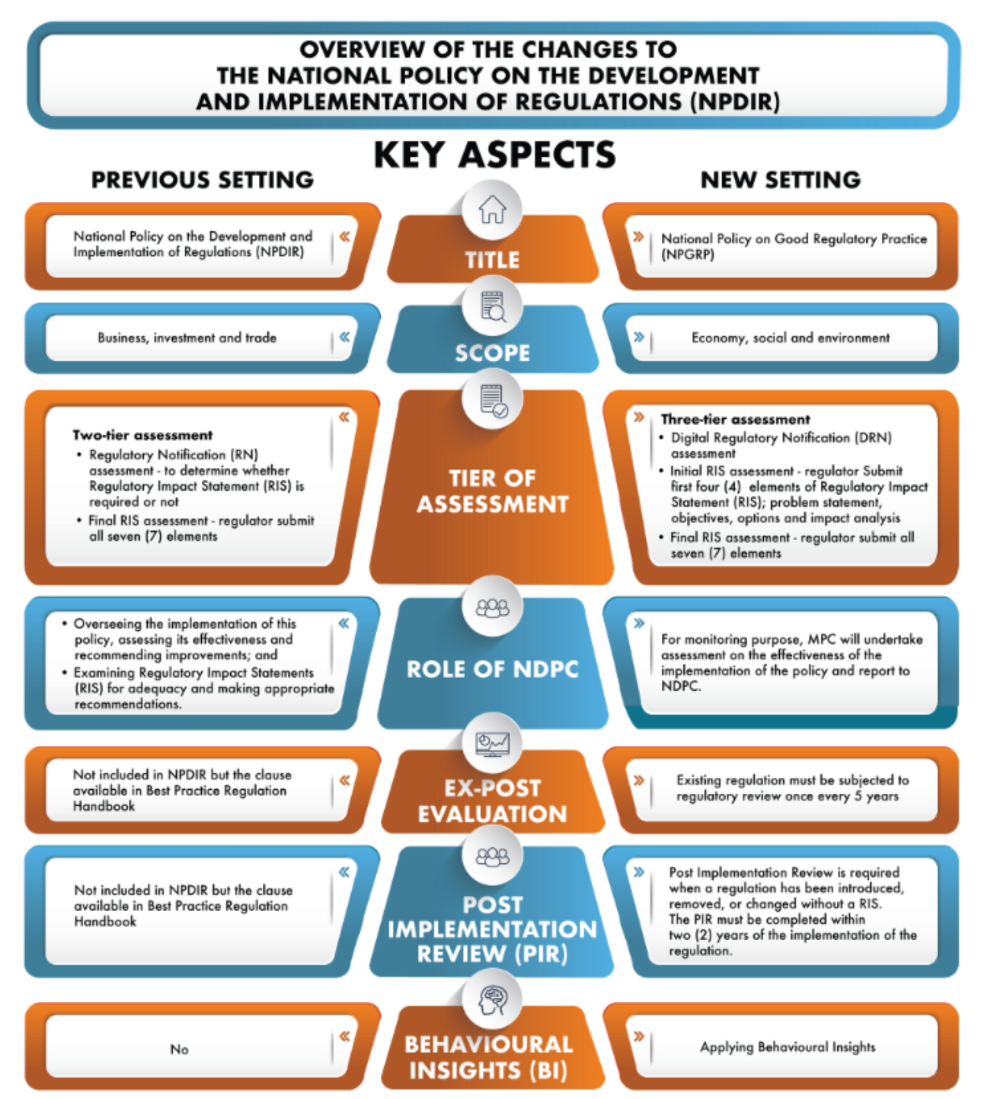 The introduction of National Policy on the Development and Implementation of Regulation (NPDIR) which formalized in 2013, will be replaced with National Policy on Good Regulatory Practice (NPGRP) in providing clearer and better guidelines on the adoption of GRP. NPGRP will focus on improving quality of both new and existing regulations.